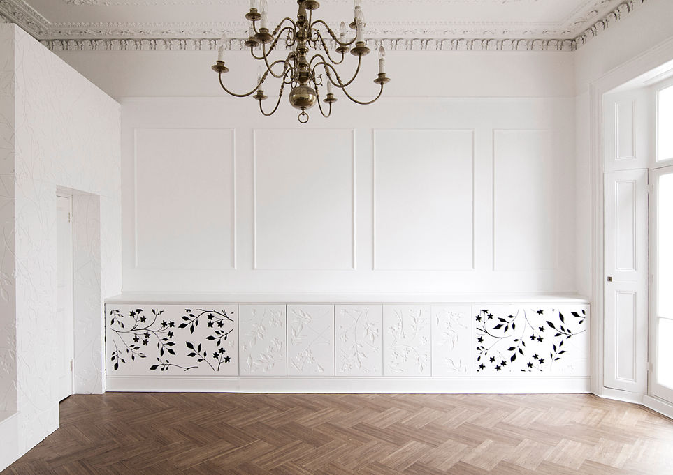At the entrance, as well as in selected living areas, original radiators and pre-existing joinery units were removed and replaced with a series of custom-fabricated MDF panels, spray-painted to achieve a smooth, seamless finish. These panels feature laser-cut motifs—a contemporary reinterpretation of Jasmine, a celebrated wallpaper pattern by 19th-century designer William Morris. This decorative layer not only introduces texture and shadow play but also pays homage to the Arts and Crafts tradition, recontextualised within a minimalist aesthetic.